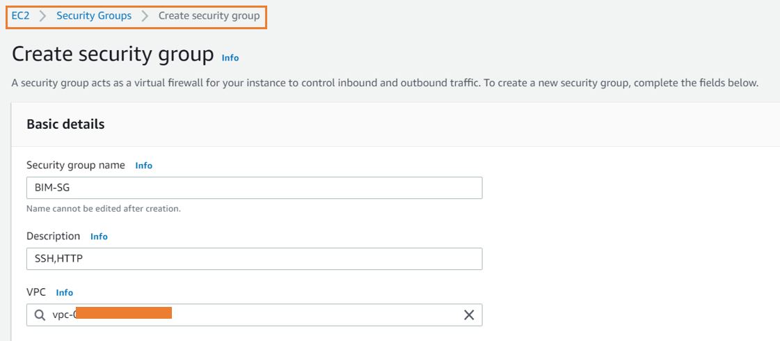 보안그룹 이름과, 연결할 vpc 를 선택합니다.