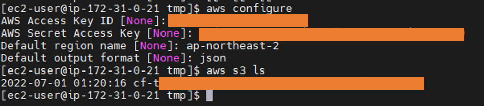 다시 ssh 화면으로 돌아와서 aws configure 명령어를 마무리 해 줍니다.