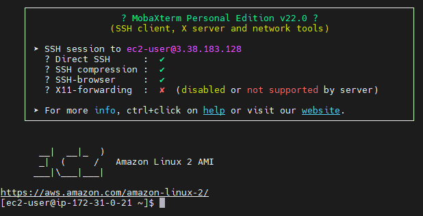 Mobaxterm 을 이용해서 퍼블릭 ip 와 ec2-user 유저이름과 설정한 키로 접속을 시도 합니다.