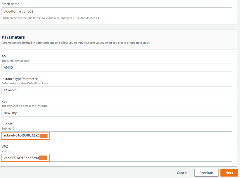 Parameters 변수값을 여기서 이용할 수 있습니다. 임의로 VPC 나 Subnet ID 를 설정해두었지만 그대로 업로드해도 문제가 없습니다. 생성 후 변수값만 변경이 가능합니다.