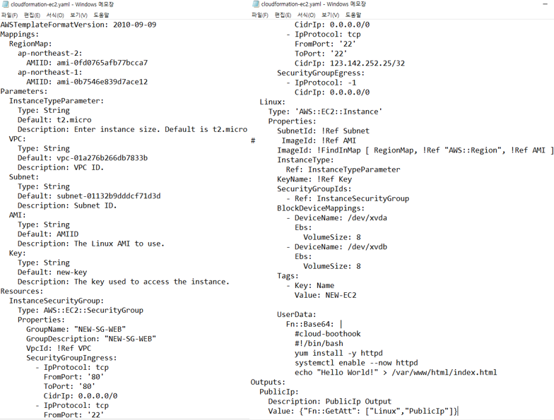 Parameters : 템플릿 스택시 입력할 매개 변수의 목록 (ex/ AMI ID, VPC ID, Subnet ID)