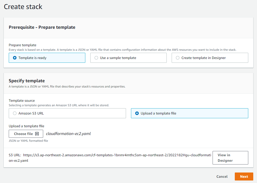 샘플 템플릿이 .yaml 파일에 저장되어있으므로 준비된 템플릿으로 업로드해 줍니다.
