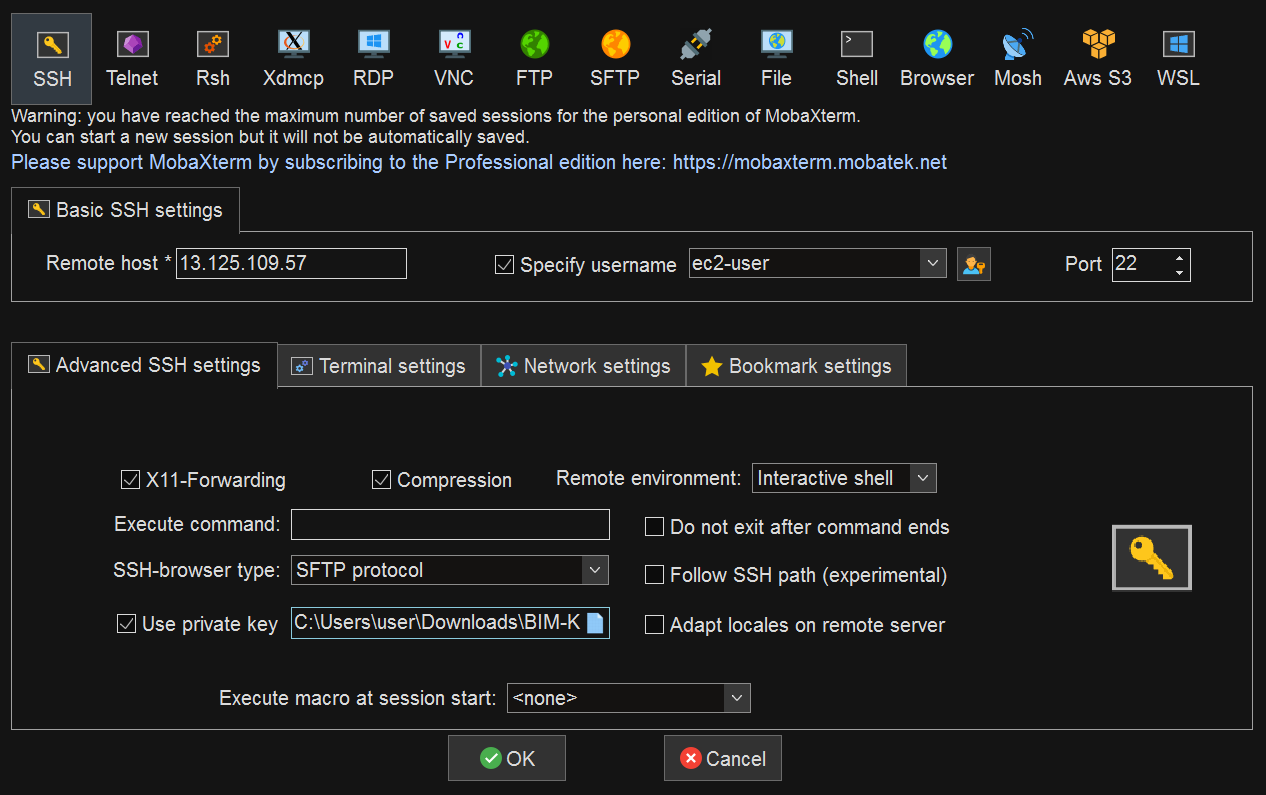 방금 생성한 EC2 의 public ip 를 이용 해 ssh 로 접속 해 줍니다.