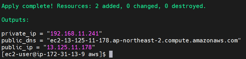 잘 적용됬다는 메세지와 private ip 와 public ip 를 할당 받았습니다.