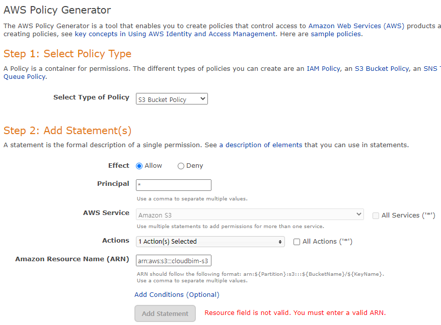 해당 버킷에 들어가는 모든 객체들은 퍼블릭 하게 읽기 허용가능하도록 정책을 설정해두고 Add statement 를 눌러줍니다.