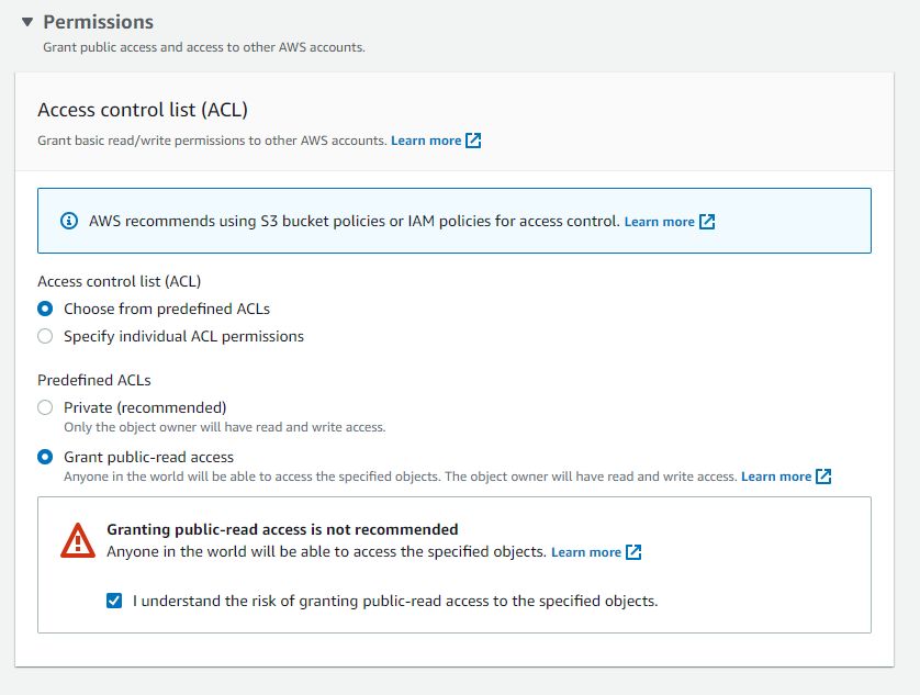 그리고 하단에 추가 설정 부분에 보면 ACL 설정이 있습니다. 퍼블릭 읽기를 허락해주는 Grant public-read access 를 체크해줍니다. 이는 추후에 따로 설정할 수도 있습니다.