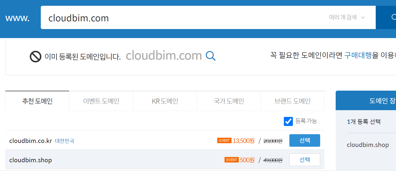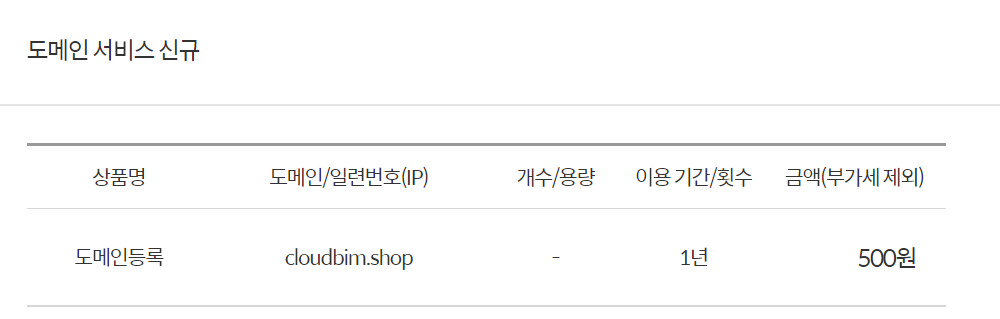 원하는 도메인 주소 입력 및 .shop 주소로 선택합니다. ( 약 500원 )