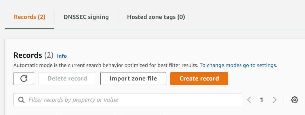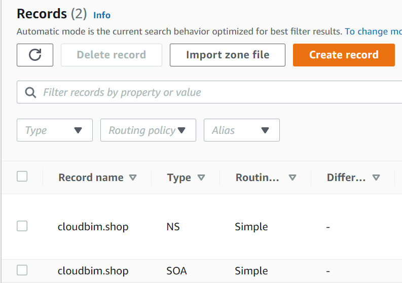 금방 생성한 호스팅 존에서 도메인네임의 NS 와 SOA 유형이 생성되었습니다.