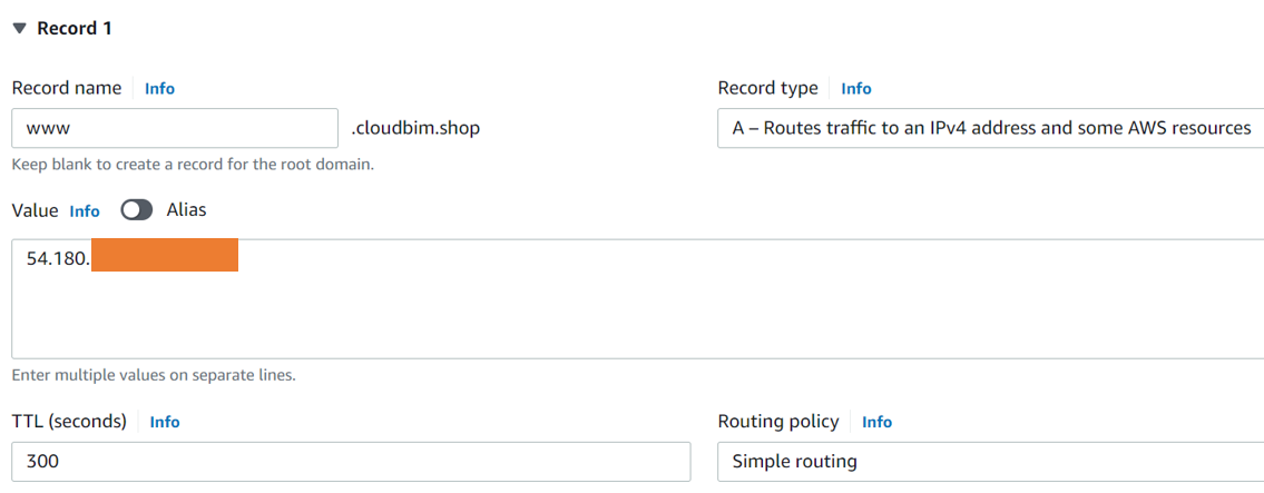 원하는 하위 도메인 주소와 A 레코드 타입, Value 에는 앞 단계에서 할당받은 탄력적 ip 주소를 적어줍니다.