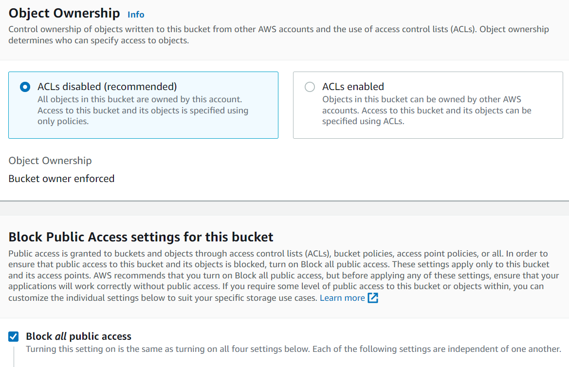 Cloudfront 를 통해서 접근을 할 예정이기도 하고 보안상의 이유로 퍼블릭 차단은 그대로 유지 해 봅니다.