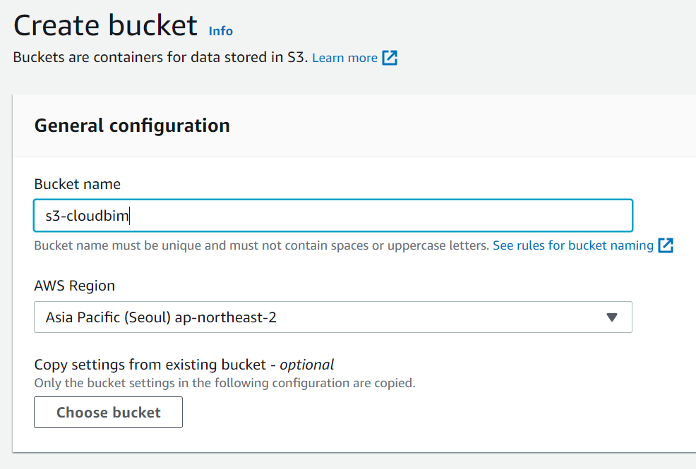 고유한 버킷 이름을 지정 해 주고 파일이 저장될 지역을 선택 해 줍니다.