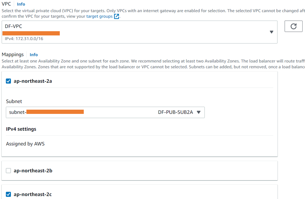 EC2 를 생성해 놓은 네트워크 환경을 선택 해 주고, 가용성을 위해 2A,2C 를 선택 해 주었습니다.