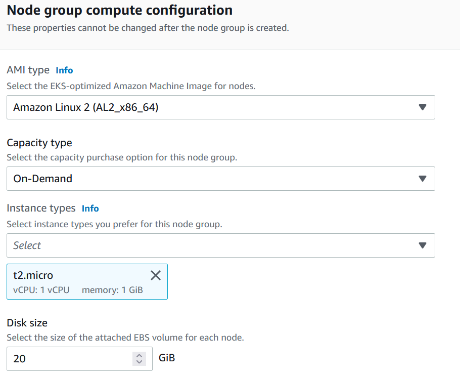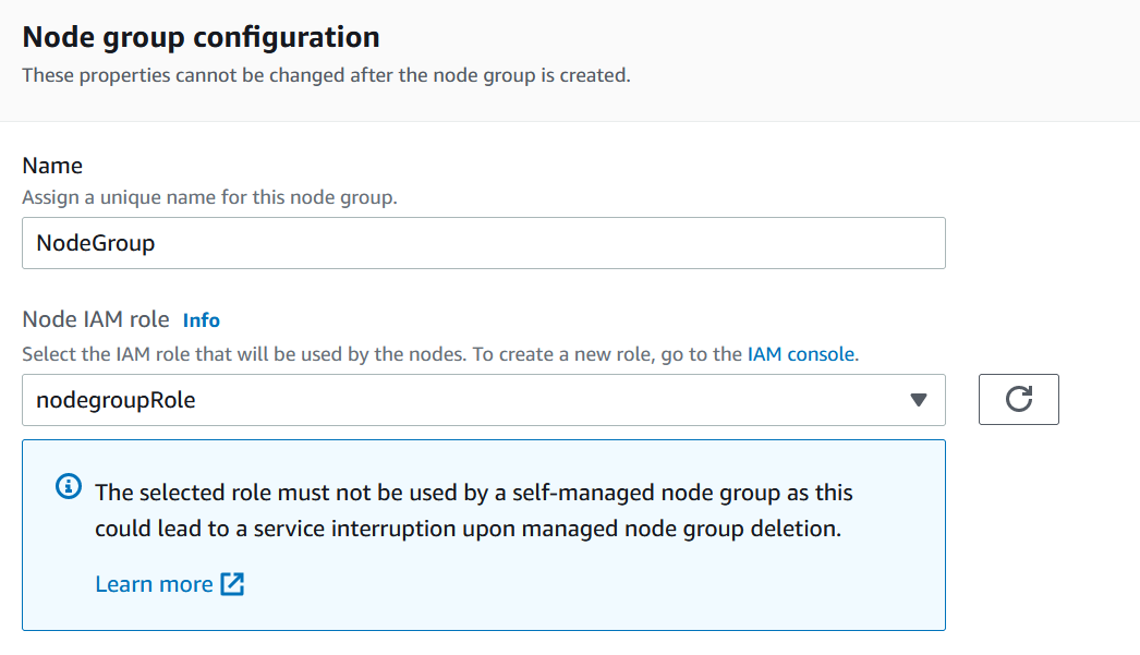 노드 그룹 이름과 노드 그룹 역할을 지정 해 줍니다. 노드그룹 역할이 없다면 새로 생성 해 보도록 합니다.