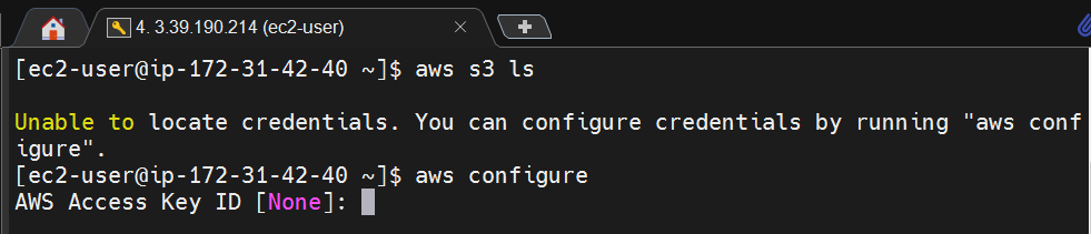 aws 에 접속이 안되있으니 aws configure 명령어로 크리덴셜 정보를 넣어줍니다.