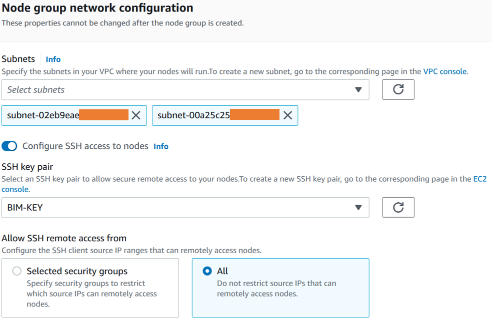 기본으로 설정되있는 서브넷 선택에 이어 노드 SSH 접근을 허용해주고 키를 선택 해 줍니다.