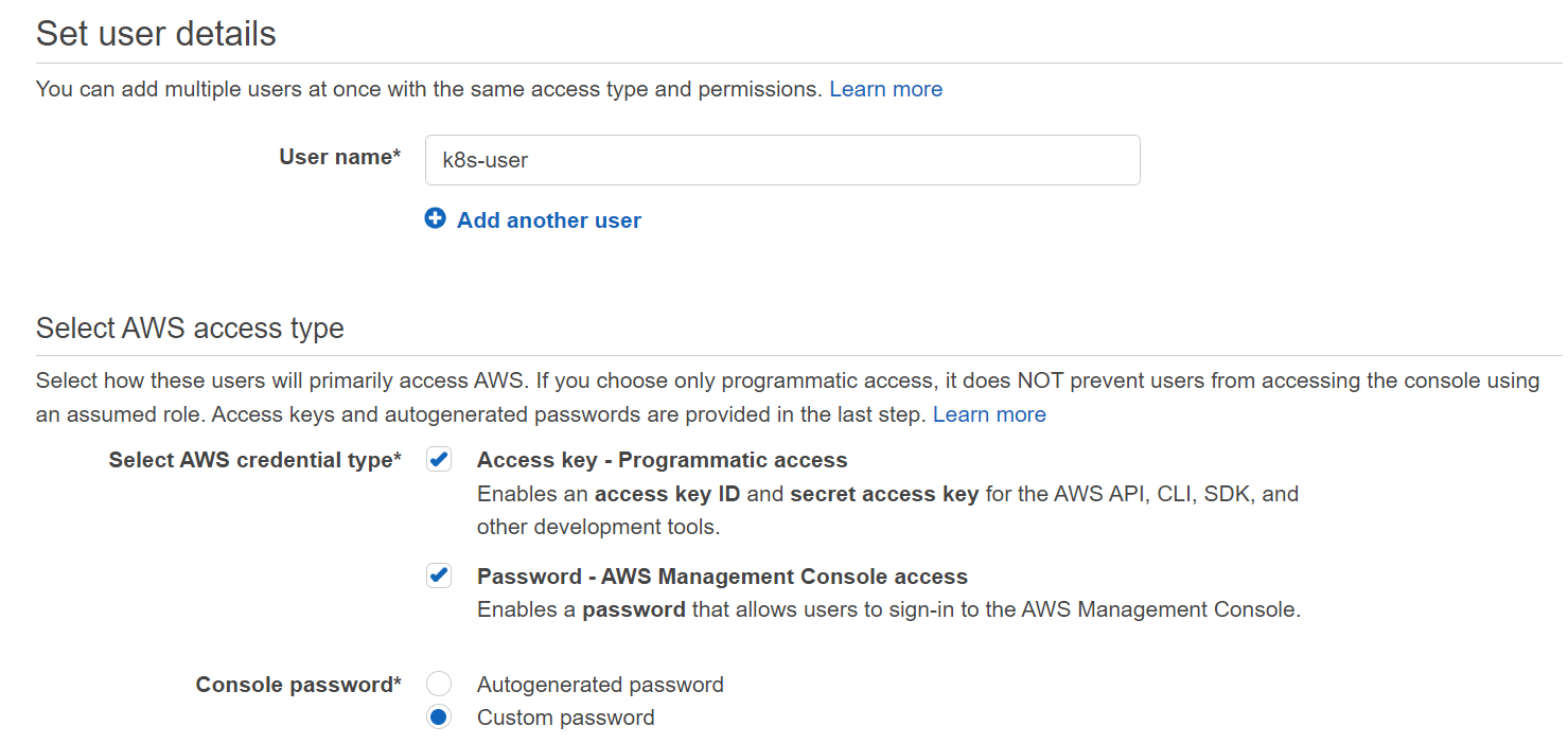 k8s-user 란 이름으로 액세스키와 패스워드 둘다 선택 해 줍니다.