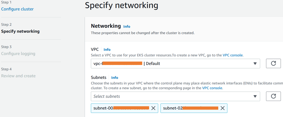 step 2 단계에서는 네트워킹 설정인데 ec2 와 같은 vpc 를 설정해 주었으며 서브넷은 PublicA/C 두가지만 선택 하였습니다.