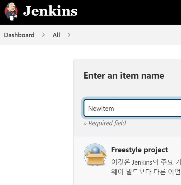 dashboard - new item 생성으로 새로 추가할 아이템이름을 작성하고 아래 Freestyle project 를 눌러 줍니다.