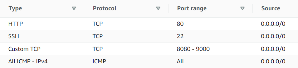 보안 그룹에서는 다음과 같은 포트를 열어서 생성한 보안그룹을 연결 해 주었습니다.