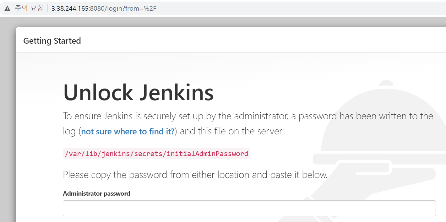ip 주소:8080 으로 접속 시 다음과 같은 창이 뜹니다. 패스워드 부분에 위에 따로 받아놓은 비밀번호를 적어주고 들어가면Cutomize Jenkins 창은 닫아주고, start using Jenkins 으로 시작 해 줍니다.
