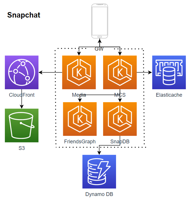 사용자들이 보내는 스냅을 EKS 미디어 클러스터로 전달하고 Cloudfront 로 보내서 S3에 보관한다. 클라우드 프론트의 엣지 기능으로 가까이 있는 사용자에게 필요할때 빨리 가져올 수 있도록 가능하게 한다.