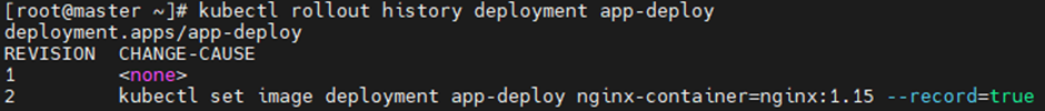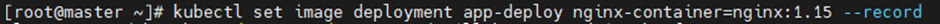 kubectl set image deployment app-deploy nginx-container=nginx:1.15 --record