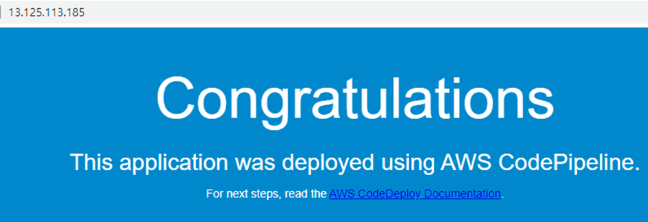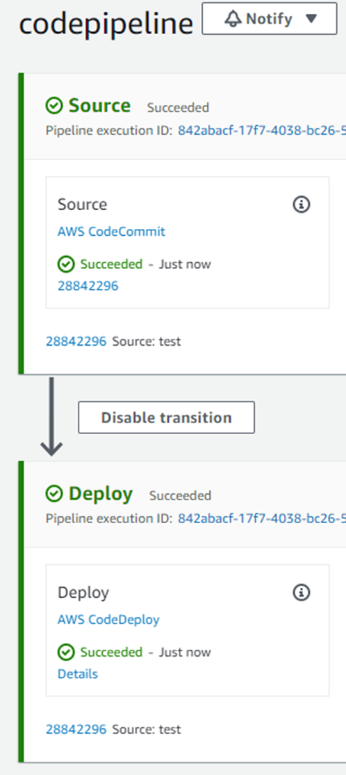 코드 파이프라인에 대한 배포가 정상적으로 완료되면 다음과 같이 성공적으로 완료 됩니다.