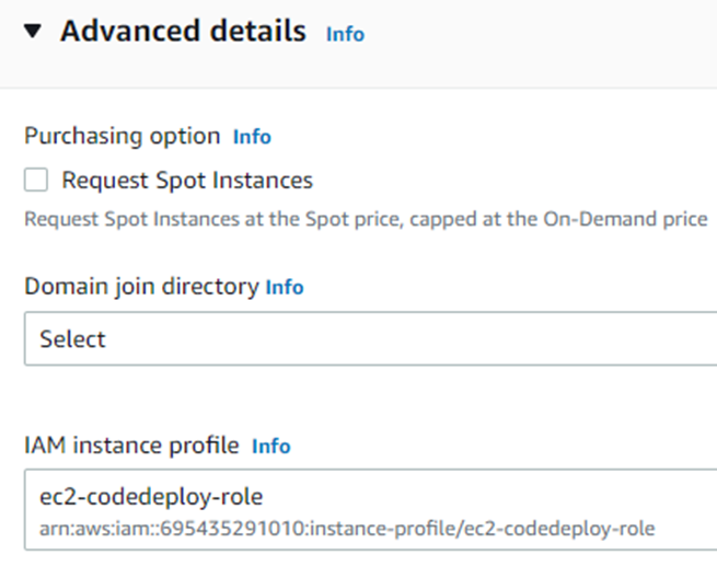 IAM 인스턴스 프로필의 이전 생성해둔 ec2-codedeploy-role 을 설정 해 줍니다.