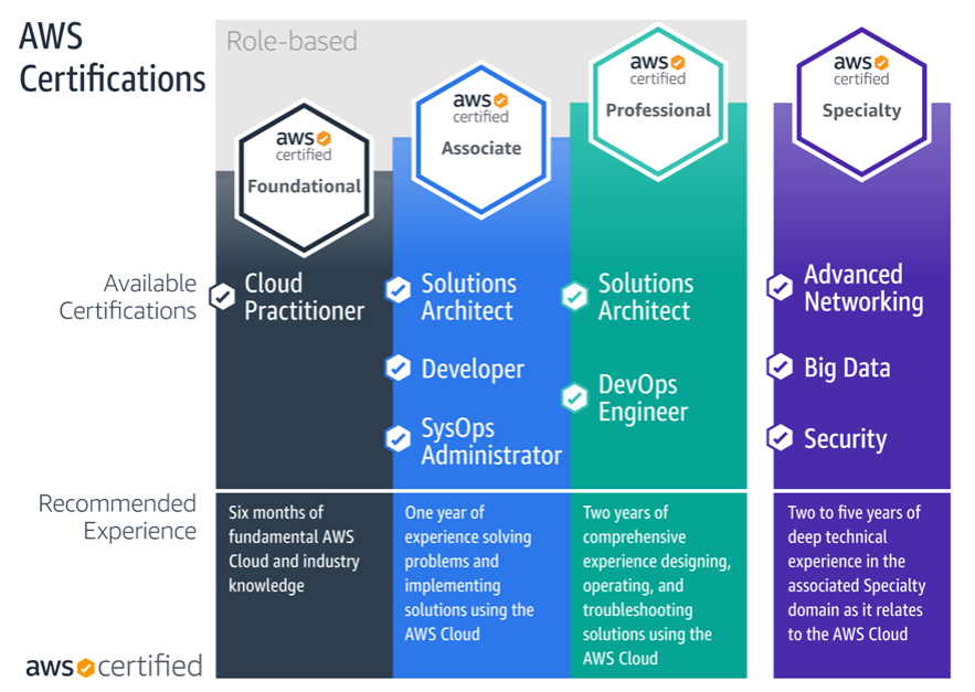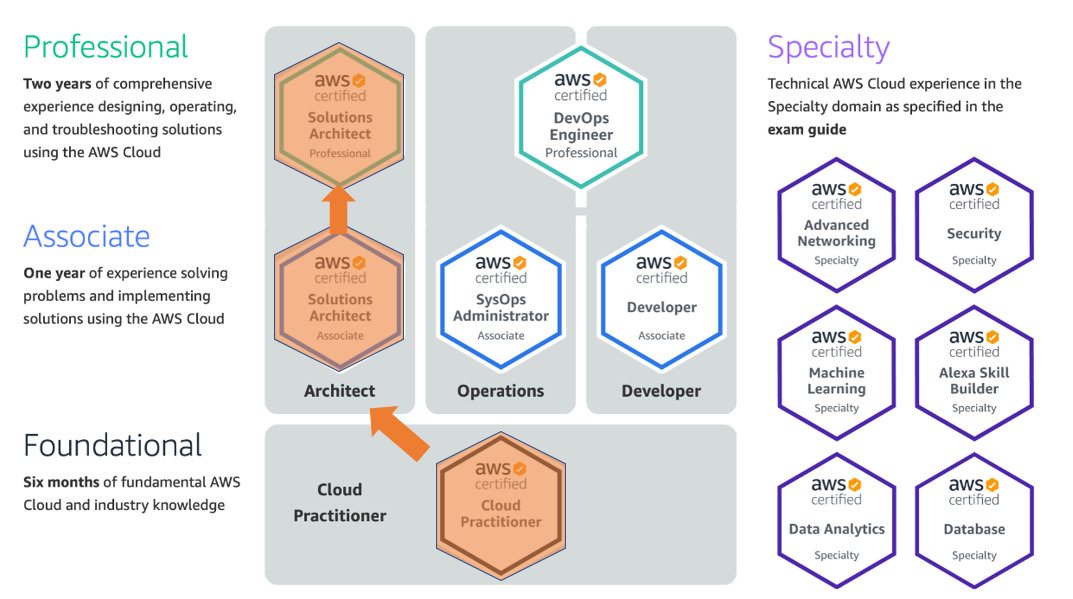 AWS Cloud Practitioner - 가장 기본과정으로 AWS 서비스들에 기본적 개념과 구성요소들에 대한 지식들을 요구하는 시험입니다. 정석적으로 6개월정도의 기본 AWS 클라우드 경험이 선행되어야합니다.