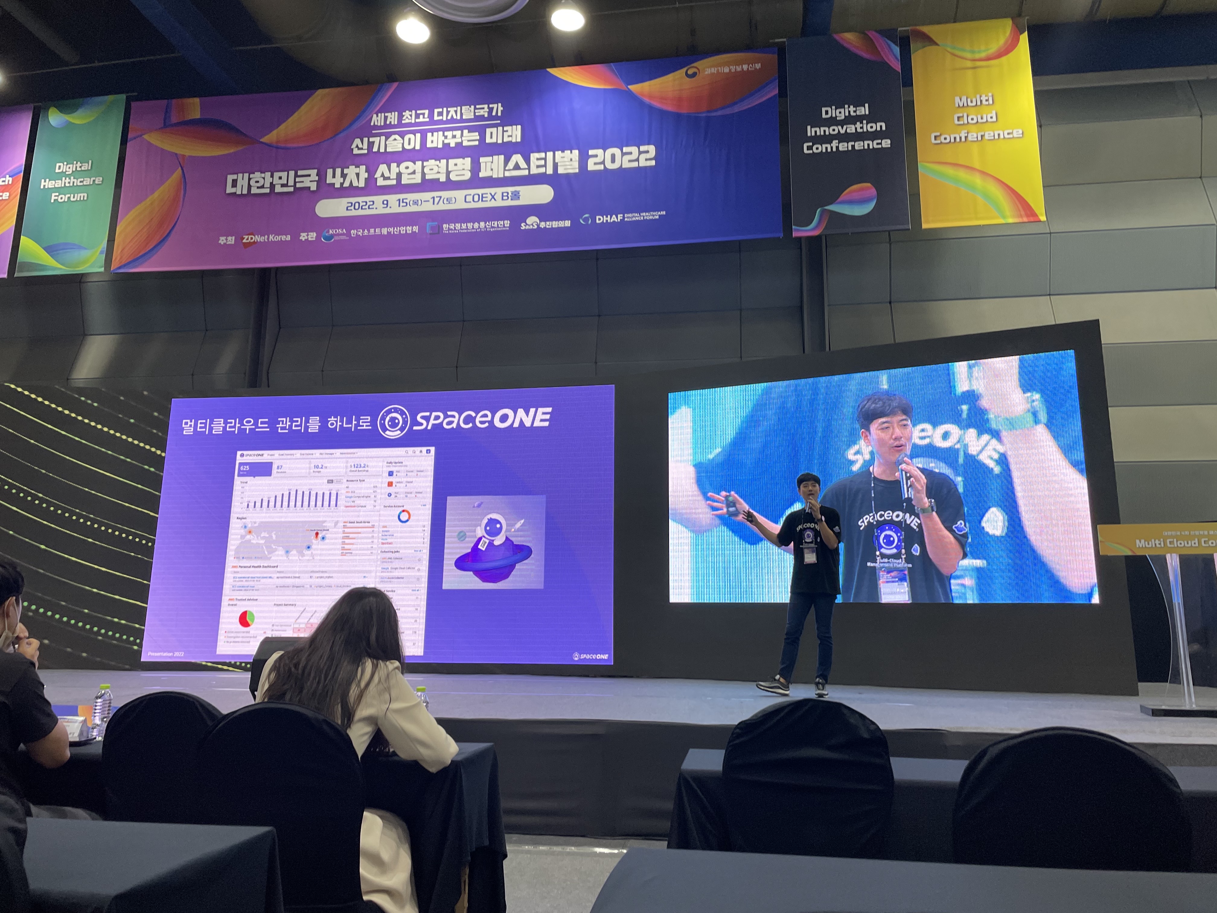메가존 클라우드 강 팀장님께서 멀티클라우드 통합 운영 방안으로 지난 7월에 출시한 SpaceONE 에 대해 설명하고 있는 모습입니다. 멀티클라우드를 사용하고 있는 기업에서 비용 사용 목록, 모니터링 서비스, 각 클라우드 서비스별 사용량 등을 SpaceONE 과 함께 효율적으로 관리해 낭비되는 자원이나 비용들을 최소화 할 수 있습니다.